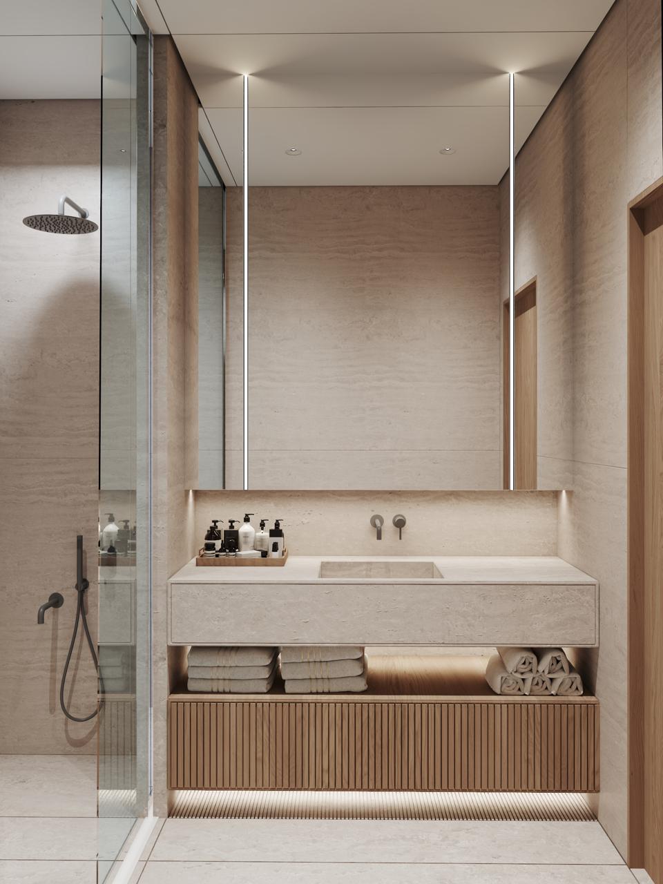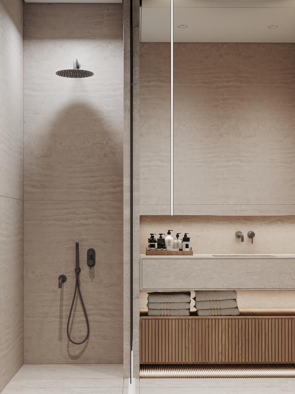Floor-to-ceiling porcelain stone tile bathroom walls and floor